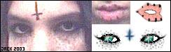 from punkrockchick87:Hi!!! I like your site about gothic make-up! I included my 'gothic eyes' in this e-mail, it looks great on both eyes but looks very special if you leave one eye plain without the dots! I like it best when you use a black eyeliner pencil firstÊand then make the dots with black liquid eyeliner (also cool if you use red of purple eyeshadow)!!!! Bye , hope you like it! | |||