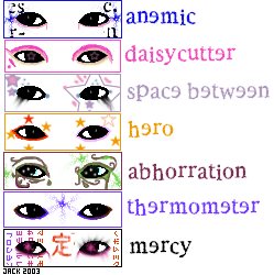 1. Anemic Random black characters above and below outside corners of eye, signs of some sort. Add pink liner below eye, trail downward below inside corners a bit. Blue stars with fading tips on both outside corners of eye. 2. Daisycutter Starts out with a peach-like shade of pink lining entire eye, trails at a slant at both corners, one above and one below. Dark pink above the peach shade above eye. Cream-yellow below peach shade underneath eye. Two quick swipes below one of them adds accent. 3. Space Between Line bottom of eyes with black. Smear a bit with an opposing downward motion about 3/4ths to the outside of the eye. Periwinkle blue filled in circles on both corners of eyes. Three dots lined up with the smear and above the eye. Left: Small grayish purple star next to outside corner. Slightly larger star of the same color above. Add light pink centers to both. Right: Small grayish purple star below eye about 1/4th inward. Outline of huge star around entire eye. Pink accents at where the corners go in on the outline and at the tips of the star. 4. Hero One eye outlined with bright orangeish red color; opposing lined with soft pink. Random stars, some outlines, some filled, of bright orange-red and soft pink and yellow orangeÊ surrounding eye. 5. Abhorration Swirls of dark red and bright green and dusty gold around eyes, one's colors a step brighter [more green than red]. Sort of a royal feel to it; no need to be symmetrical.