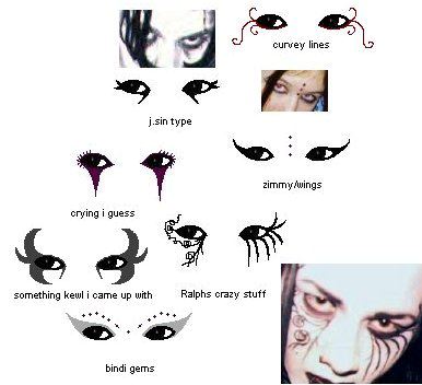 Mai Molko, another UK goth, sent me a versitile design. Done with liquid jet black eyeliner and looks great with any coloured lipstick, though especially striking with black lipstick. Also for a softer effect can be done with black eye shadow... and a silver eyeshadow can be applied to the brow bone to make the look stand out more.